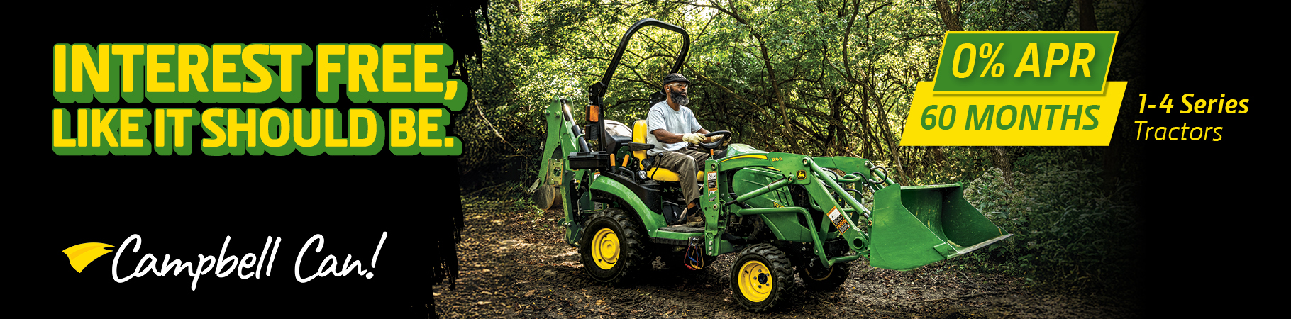 Right now, get 0% financing for 60 months, on select 1-4 Series John Deere compact tractors.
